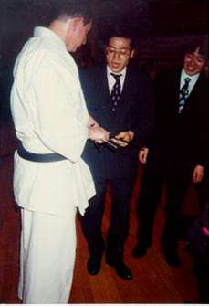 ![]() Harvey Torok (left) watches son Mark deliver a teisho ushi. (Vine Street Dojo) |